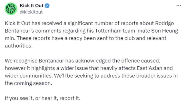 킥잇아웃은 20일 "우리는 로드리고 벤탄쿠르가 손흥민에 대해 언급한 내용에 대해 상당수의 제보를 받았다"며 "이에 관한 보고서를 이미 클럽과 관련 당국에 전달했다"고 공식 발표했습니다. 킥잇아웃은 스포츠에서 차별을 근절하자는 취지로 1993년에 설립된 단체로, 평등과 포용을 최우선으로 생각하는 기관입니다. BBC는 이를 보도하며 사건의 심각성을 강조했습니다.