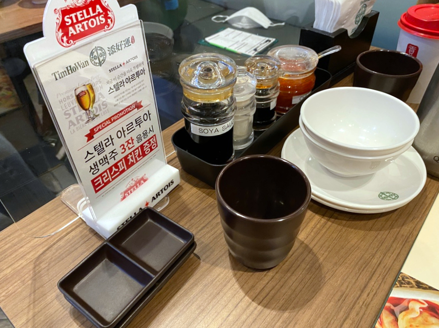 팀호완 가게 입구의 대기석과 웨이팅 등록 기계