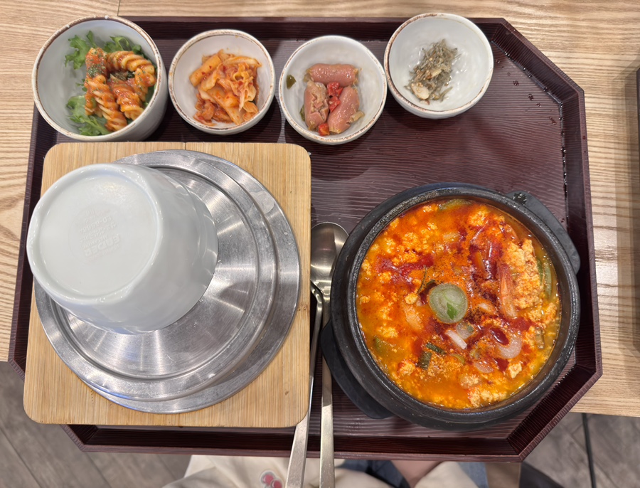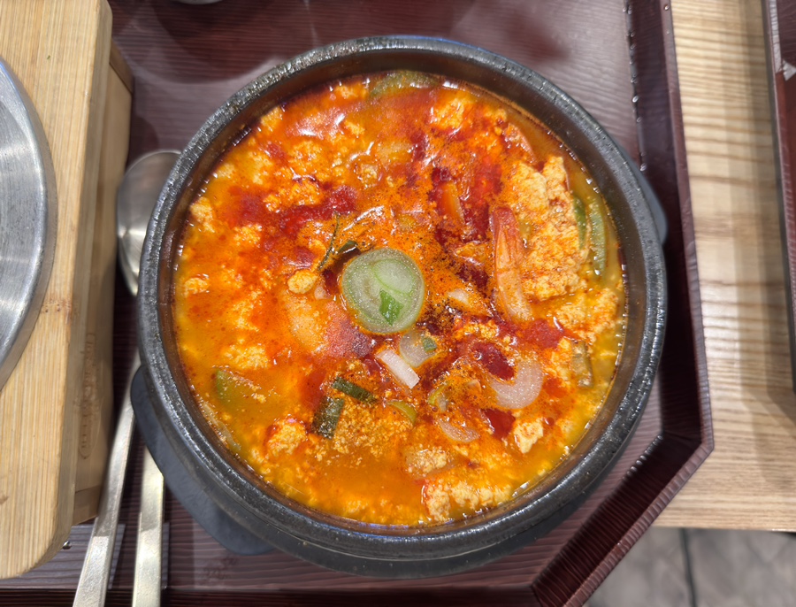 강릉식 몽글순두부찌개 솥밥은 순두부의 부드러운 식감과 매콤한 국물이 잘 어울렸습니다.