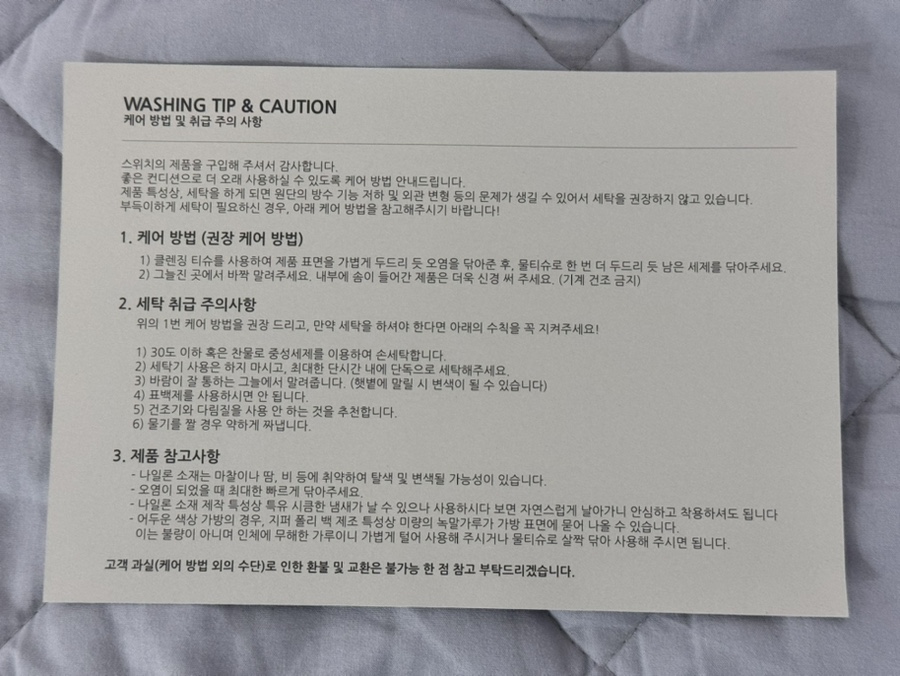 레이어 처리가 되어 있어 터치감이 좋고, 내부 충전 재질로 충격으로부터 물건을 보호할 수 있습니다. 세탁 방법과 주의 사항을 잘 숙지하여 관리하면 오랫동안 사용할 수 있습니다.