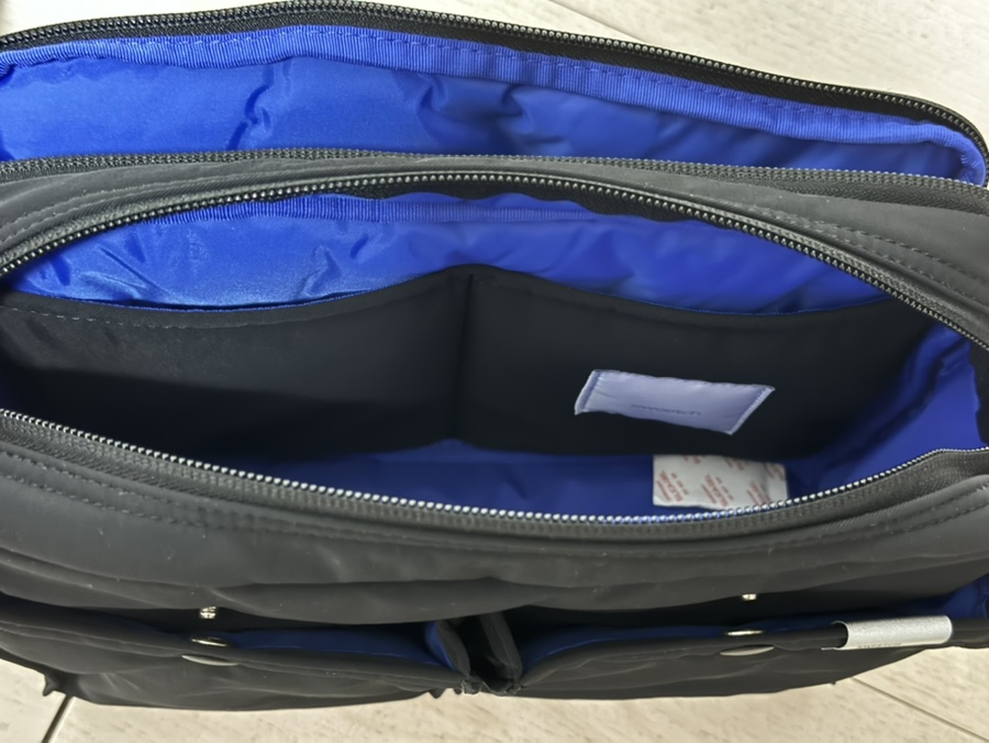 내부에는 스위치의 시그니처 컬러인 푸른 블루가 포인트로 들어가 있어 멋스럽습니다. 파티션이 있어 스마트폰, 화장품, 노트 등을 구분해서 넣기 좋습니다.