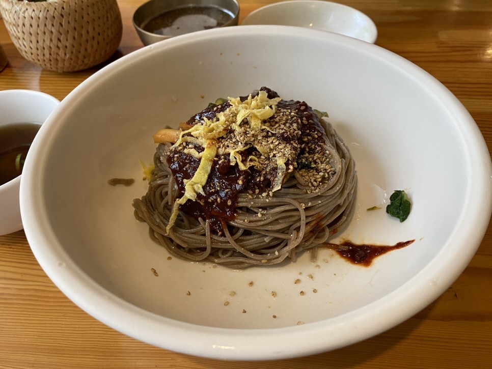 메뉴 중 나물과 지단, 그리고 달콤한 양념을 올려 내는 비빔 메밀국수는 든든한 한 끼 식사로 충분하다.