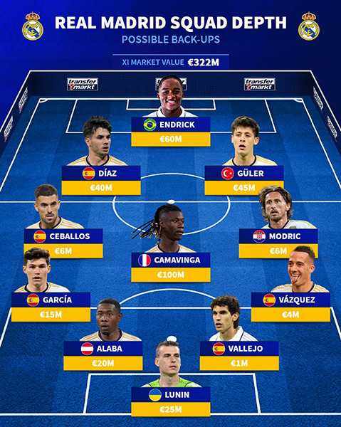 레알 마드리드는 다음 시즌 한층 더 강력한 선수단을 보유하게 되었습니다. 글로벌 이적시장 사이트 ‘트랜스퍼마켓’은 레알 마드리드의 선발 라인업과 백업 자원을 공개하며, 초호화 선수층을 예상했습니다.