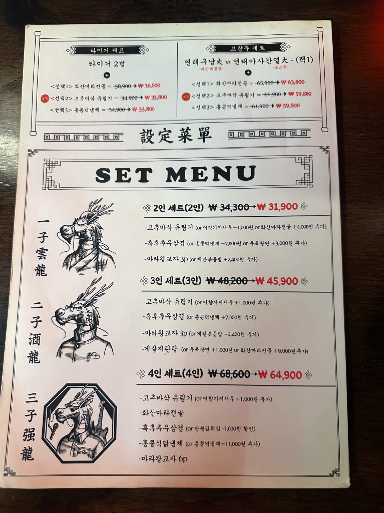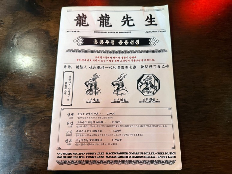 홍콩 현지의 야시장에서 자주 먹었던 타파스 스타일의 작은요리와 용용선생의 시그니쳐인 큰요리들로 구성되어 있다.