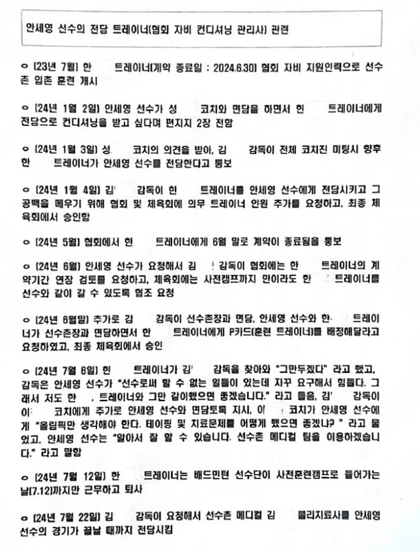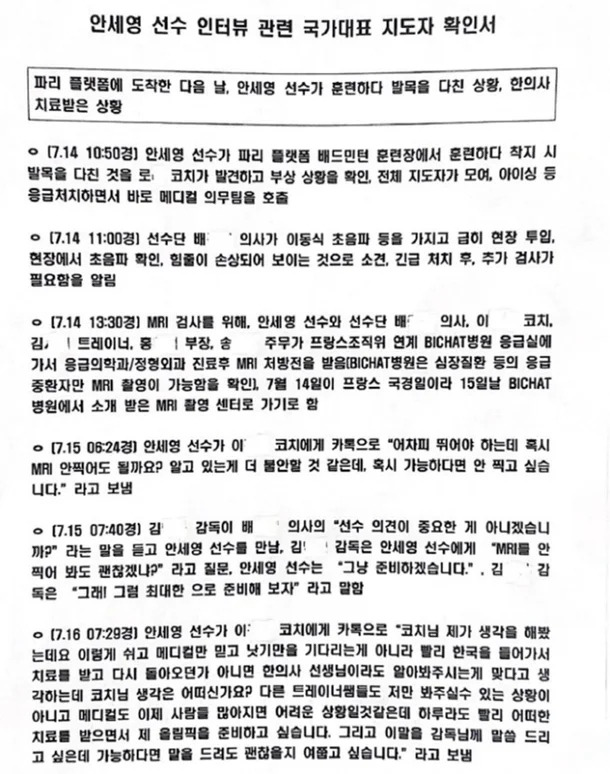 대한배드민턴협회는 안세영 선수의 인터뷰로 인해 올림픽이라는 축제의 장이 무거워진 점에 대해 사과하며, 5명의 코치진이 작성한 확인서를 공개했습니다. 코치진은 올림픽 준비 과정에서의 부상 관리와 선수 보호에 대한 지원을 소상히 밝히며, 안세영 선수의 발언에 대한 해명을 시도했습니다.