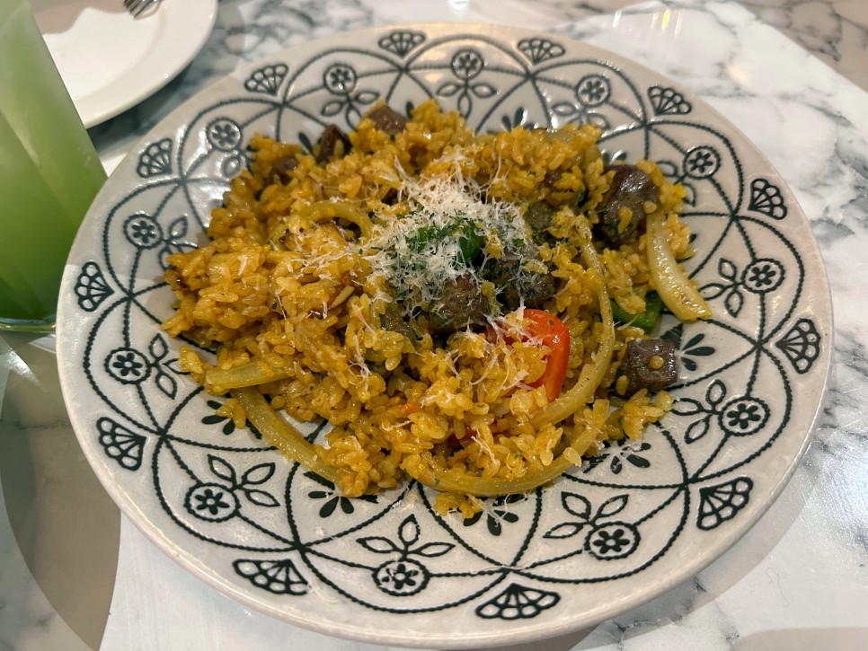 - 두툼한 스테이크와 다양한 야채를 함께 볶아낸 담백한 맛의 필라프