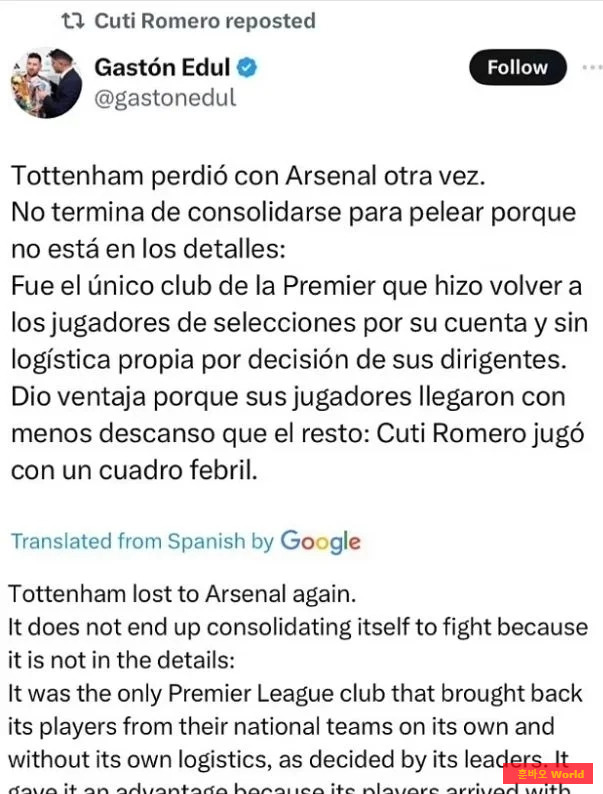 토트넘은 아스널과의 북런던 더비에서 1-0으로 패배하면서 팬들과 언론으로부터 많은 비판을 받았습니다. 손흥민이 주장 자격으로 팬들에게 사과했지만, 팬들은 만족하지 않았습니다. 그중에서도 크리스티안 로메로는 경기 패배의 원인을 구단 운영의 문제로 돌렸습니다. 그는 아르헨티나 국가대표 차출 이후, 구단이 개인 제트기를 제공하지 않은 점에 대해 소셜미디어를 통해 불만을 표출했습니다.
