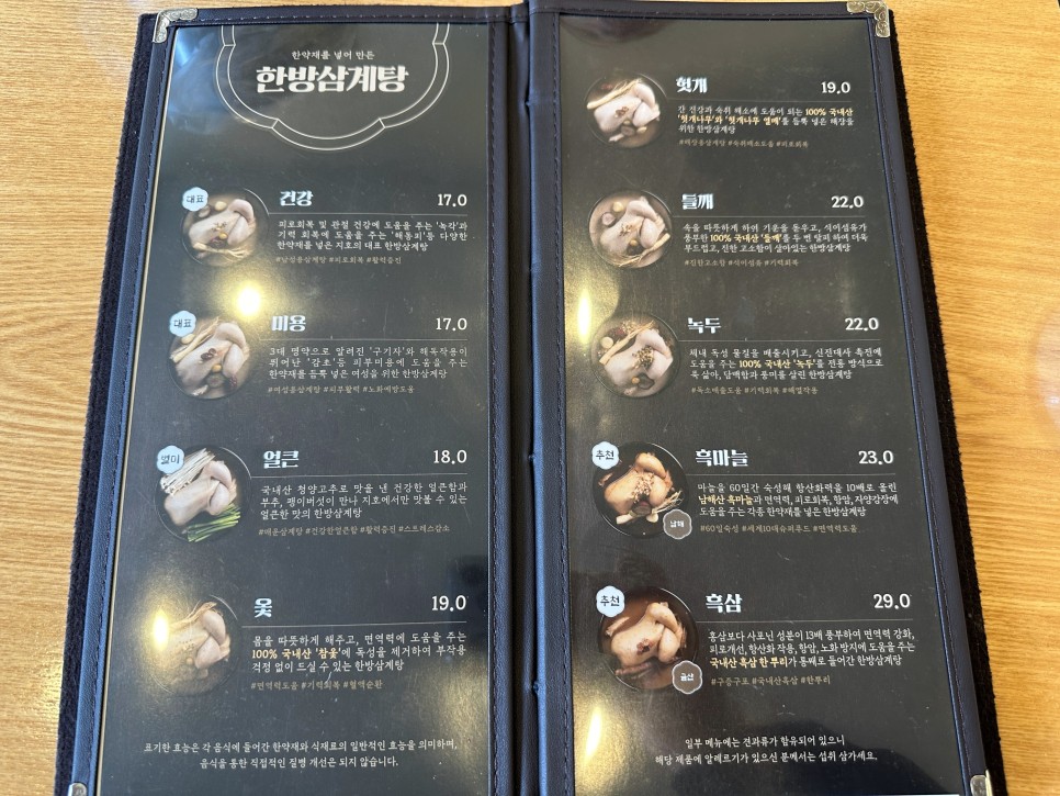 특허를 받은 한방육수에 최고의 삼계닭인 웅추와 원기회복 및 성인병 예방 등에 좋은 각종 한약재를 함께 넣어 장시간 푹 삶아 진한 국물을 느낄 수 있는 남성을 위한 한방삼계탕입니다. 특허를 받은 한방육수에 최고의 삼계닭인 웅추 원기회복 및 특히 피부미용과 노화방지 등에 좋은 각종 한약재를 함께 넣어 장시간 푹 삶아 진한 국물을 느낄 수 있는 여성을 위한 한방삼계탕입니다.