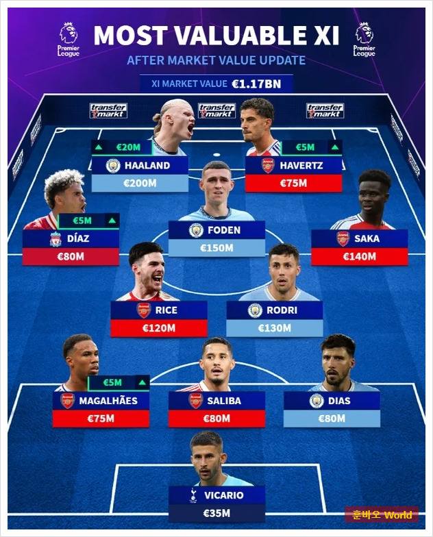 이번에 발표된 EPL 올스타팀은 축구 통계 매체 '트랜스퍼 마크트'에서 EPL 선수들의 재평가를 통해 구성되었습니다. 이 팀의 총 몸값은 1조 7000억 원을 상회하며, 그 중 대부분은 맨체스터 시티와 아스널의 선수들이 차지했습니다. 최전방에는 맨시티의 엘링 홀란과 아스널의 카이 하베르츠가 자리하며, 홀란은 몸값 2억 유로로 음바페 이후 가장 비싼 선수로 기록되었습니다.