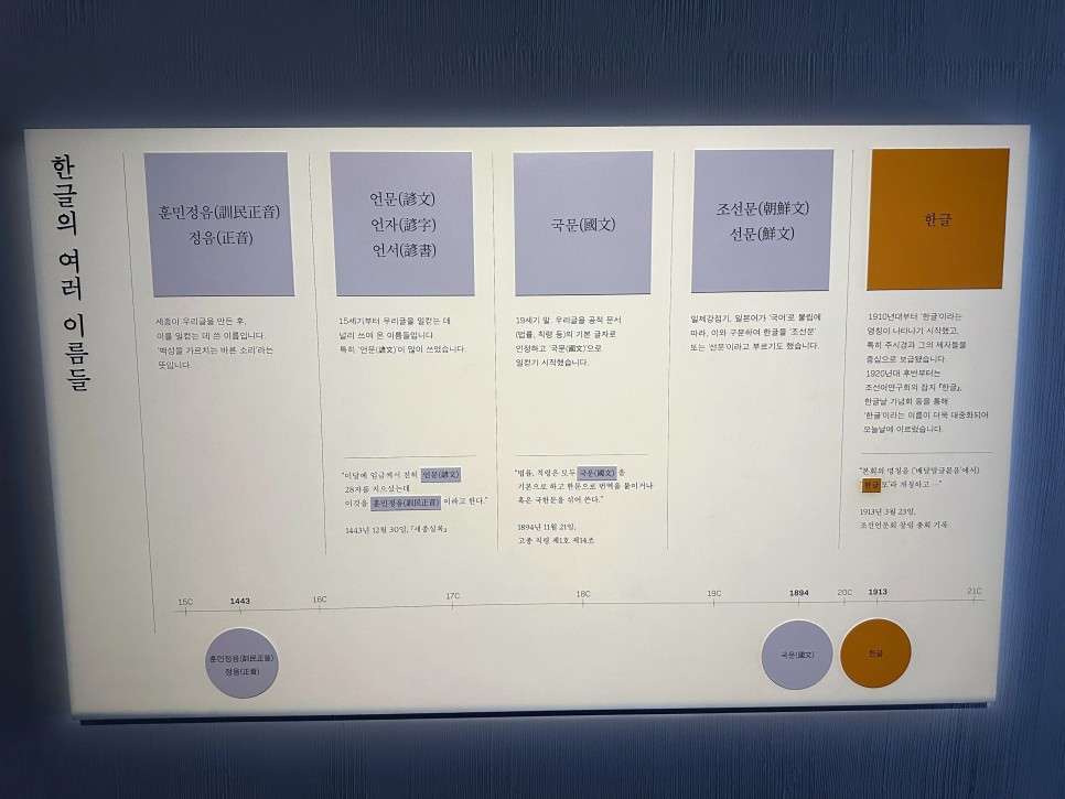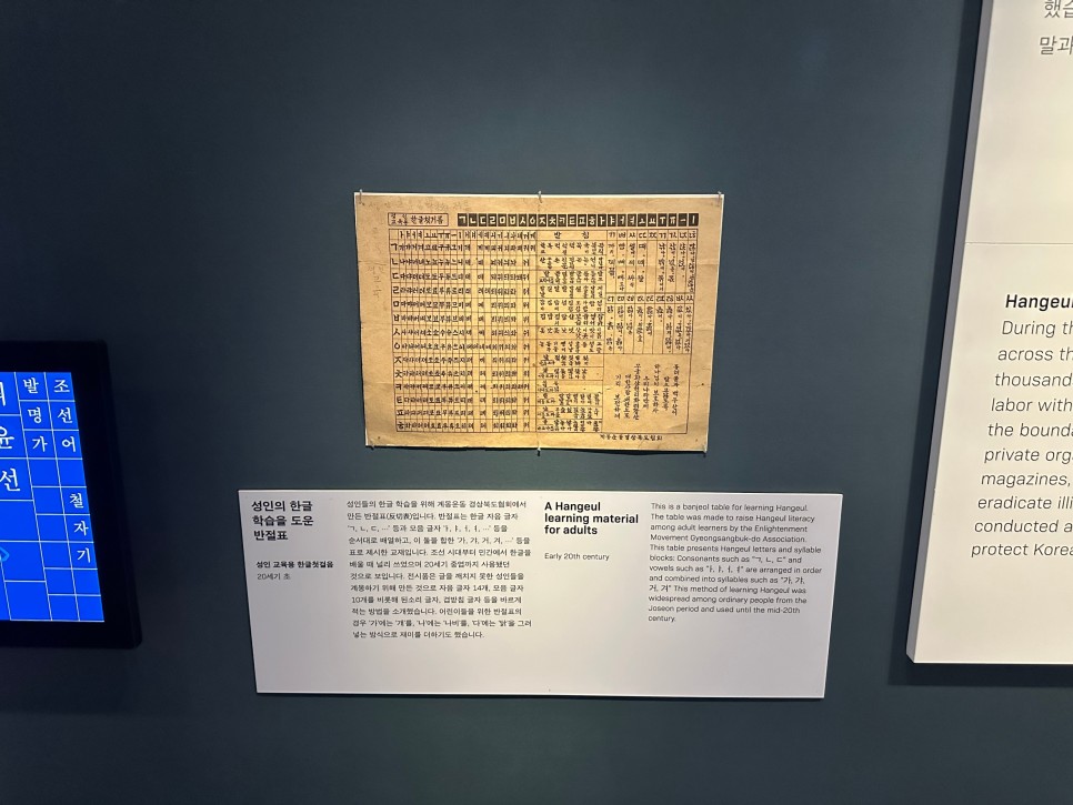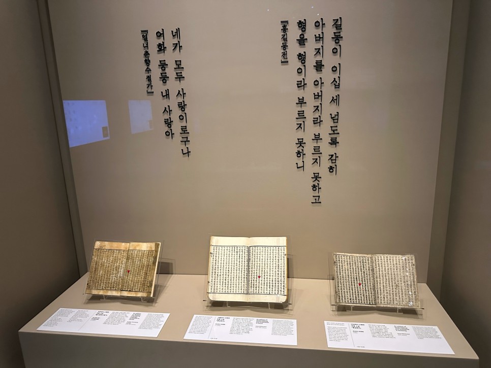 훈민정음 창제 원리는 전시관 내에 설치된 스크린에서 볼 수 있고, 언문으로 천대받던 시절의 기록이 있다.