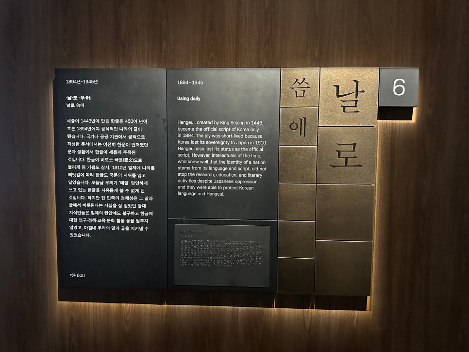 근대에 이르러서는 한글이 국문으로 지정되기부터 일제에 의해 조선어로 지위가 격하된 것, 한글을 지키기 위한 여러 사람들의 노력에 관한 내용이 전시되어 있다.