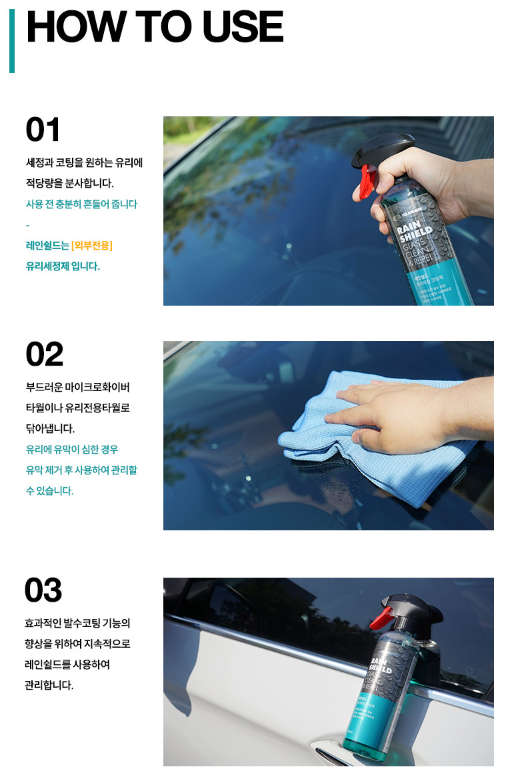 우천시 유리에 빗방울이 맺히지않고 흘러내리게 하여 빗물로 인한 시야 장애 및 난반사를 최소화한다. 시속 60km/h 부터 빗방울이 날아가며 최소한의 와이퍼 작동으로 선명한 시야를 확보할 수 있다. 레인쉴드의 지속적인 사용은 언제나 쾌적한 드라이빙 환경으로 만들어 편안한 운전을 할 수 있다.