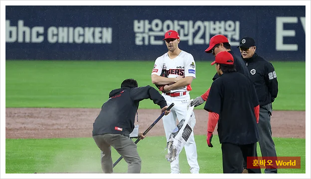 21일 광주기아챔피언스필드에서 열린 한국시리즈 1차전은 예상했던 비로 인해 경기 시작 전부터 취소 여부가 고려되었습니다. 하지만 KBO는 비가 일시적으로 잦아들면서 경기를 강행하기로 결정했죠. 그라운드 관리팀은 비가 내리는 중에도 방수포를 깔았다 걷었다 하는 작업을 반복하며 최선을 다했지만, 6회 초 결국 경기는 중단되었습니다.