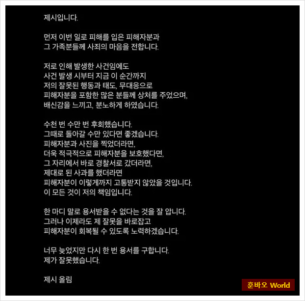 23일, 제시는 자신의 SNS에 장문의 사과 글을 올리며 다시 한 번 피해자와 그 가족, 그리고 대중에게 사죄의 마음을 전했습니다. 제시는 "수천 번, 수만 번 후회했다"며 "그때로 돌아갈 수만 있다면 좋겠다"는 심정을 털어놨습니다. 그는 더 적극적으로 피해자를 보호하지 못한 자신의 잘못을 인정하며, 사건의 책임이 모두 자신에게 있다고 고백했습니다.