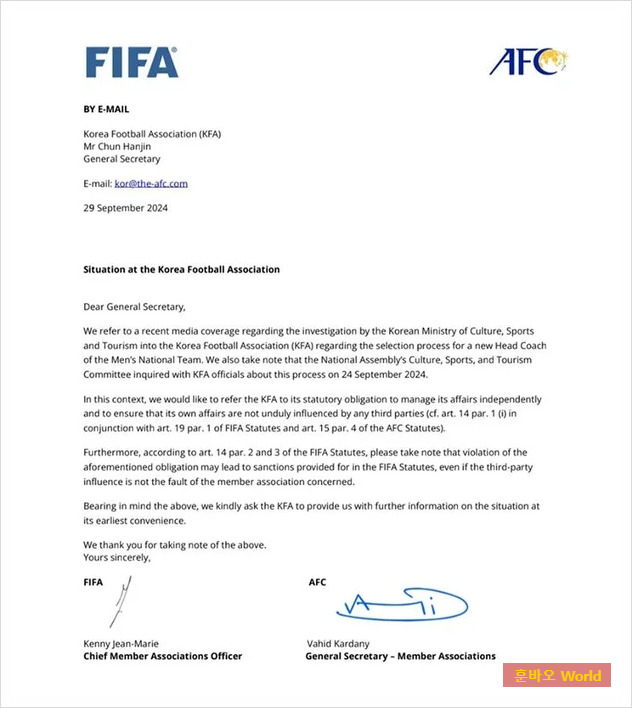 지난달 29일, FIFA는 대한축구협회가 외부로부터 부당한 간섭을 받지 않도록 주의를 촉구하는 공문을 보냈습니다. 주요 내용은 크게 세 가지로 요약됩니다. 첫째, 대한축구협회는 자율적으로 사무를 관리해야 하며 외부로부터의 간섭을 피해야 합니다. 둘째, FIFA 정관에 따라 협회는 제3자의 개입을 거부해야 한다는 점을 명확히 했습니다. 셋째, 협회는 정치적 간섭으로부터 독립적이어야 한다는 것입니다. 이는 대한축구협회에 대한 제3자의 직접적인 간섭이 FIFA 제재로 이어질 수 있다는 점을 경고한 것입니다.