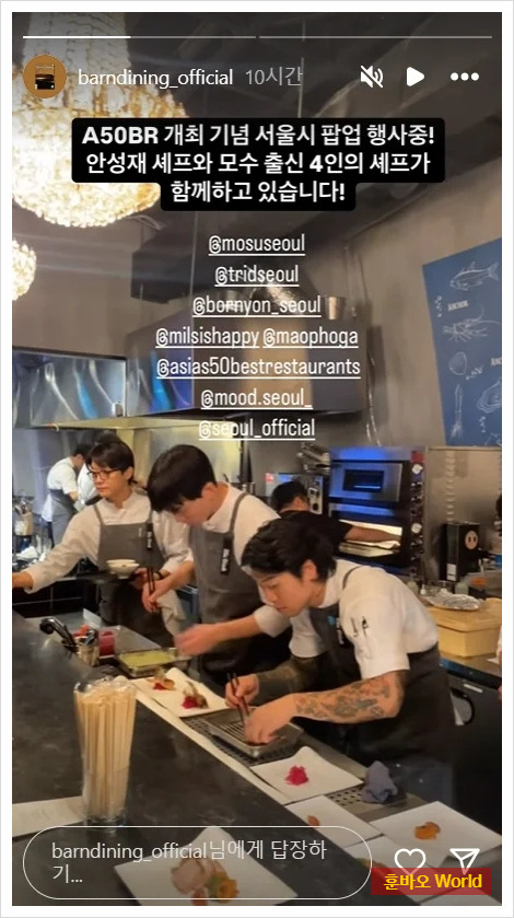 트리플스타는 3일 서울 서초구 세빛섬 무드앵커에서 열린 '2024 A50BR 서울 개최 기념 특별 팝업 행사'에 참여했습니다. 이번 행사에는 안성재 셰프를 포함한 유명 셰프들이 함께 오픈형 키친을 운영하며 손님들과 소통했습니다. 트리플스타는 포토타임에 다소 긴장된 표정이었지만 행사 일정에 적극 참여하며 프로다운 모습을 보였습니다.