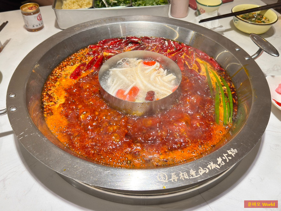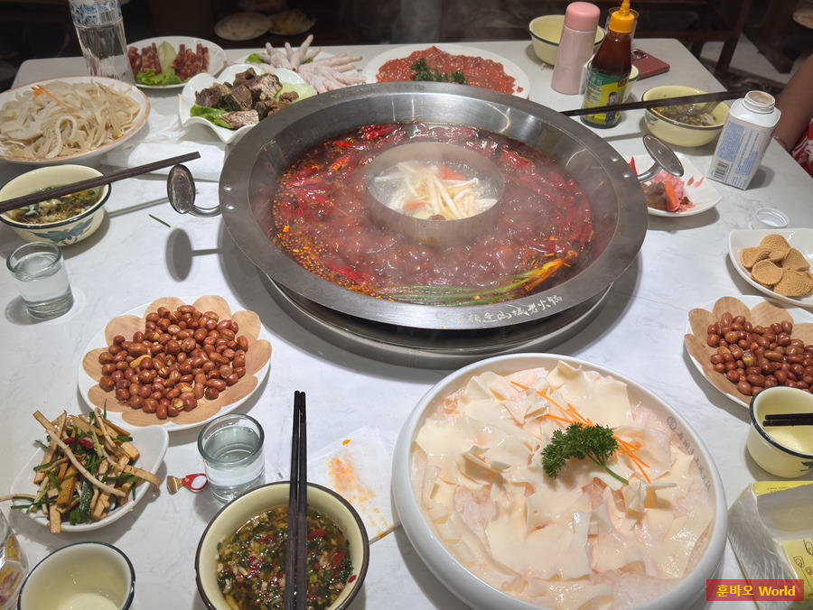 육수 색깔만 봐도 알 수 있듯이, 이곳의 훠궈는 정말 제대로 된 쓰촨식이에요. 현지 느낌 그대로 즐길 수 있었어요.