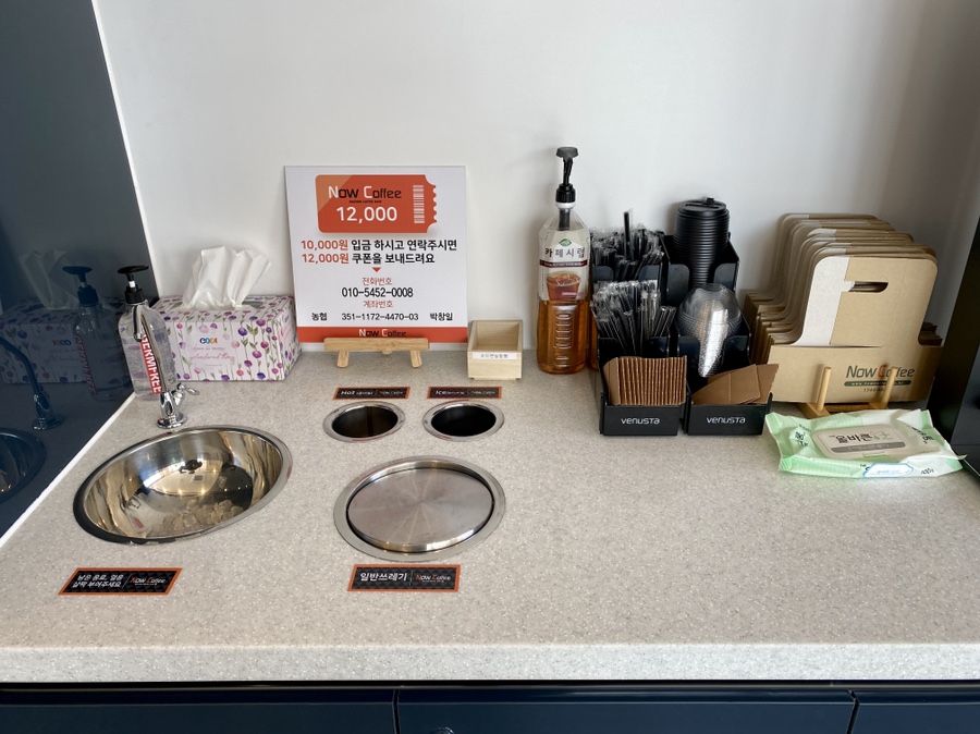 Pet컵 뚜껑, 빨대, 커피 스틱 등등 모두 구비되어 있다