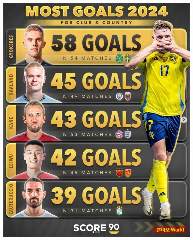 글로벌 축구매체 '스코어90'이 발표한 2024년 최다골 순위는 많은 축구 팬들의 이목을 끌었습니다. 1위는 스웨덴의 빅토르 요케레스(스포르팅CP)로, 그는 한 해 동안 무려 54골을 기록하며 전 세계 공격수들 중 최고의 성적을 냈습니다. 2위와 3위는 각각 엘링 홀란(맨체스터 시티)과 해리 케인(바이에른 뮌헨)이 차지하며 모두 예상 가능한 이름들이었습니다. 그러나 중국의 우레이가 42골로 4위에 오르며 축구계에 신선한 충격을 안겼습니다.