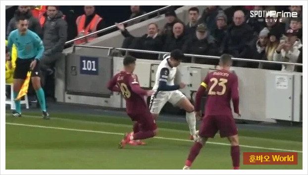 이어 달려오는 또 다른 수비를 앞에 두고 공을 오른쪽으로 치며 돌파를 시도한 손흥민은 결국 상대의 반칙을 유도해냈습니다. 이는 역습을 막기 위한 로마 수비의 고육지책이었지만, 손흥민의 기량과 침착함은 그 자체로 감탄을 자아냈습니다. 단순한 기술을 넘어, 경기 상황을 읽는 능력까지 보여준 이 장면은 손흥민이 단순한 공격수를 넘어서는 선수임을 재확인시켰습니다.