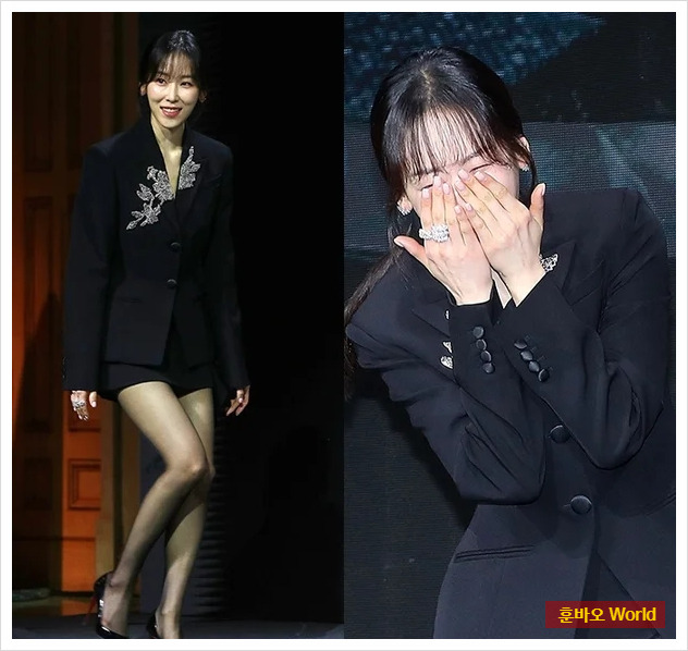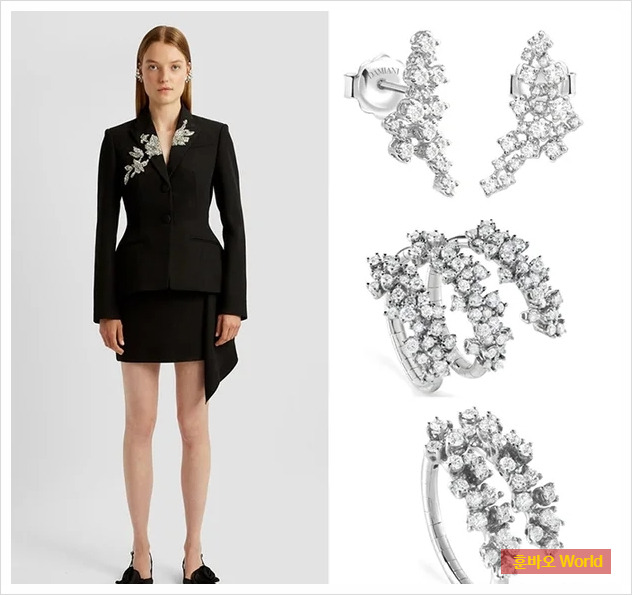 특히 손가락을 세바퀴 감싸는 디자인의 다이아몬드 반지는 1,498만 원, 이어링은 이와 함께 전체 주얼리 가격이 2,436만 원에 달하며 화려한 룩을 완성했습니다. 주얼리의 섬세한 디테일과 그녀의 깔끔한 의상이 어우러져 우아한 분위기를 극대화했습니다.