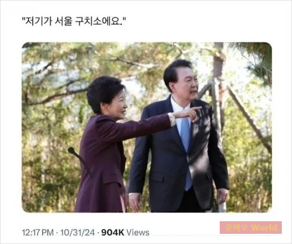 박근혜 전 대통령과 윤 대통령이 함께 찍힌 사진도 화제였습니다. "저기가 서울 구치소예요"라는 문구는 과거의 정치적 사건과 현재 상황을 연결하며 유머와 풍자를 동시에 담았습니다.