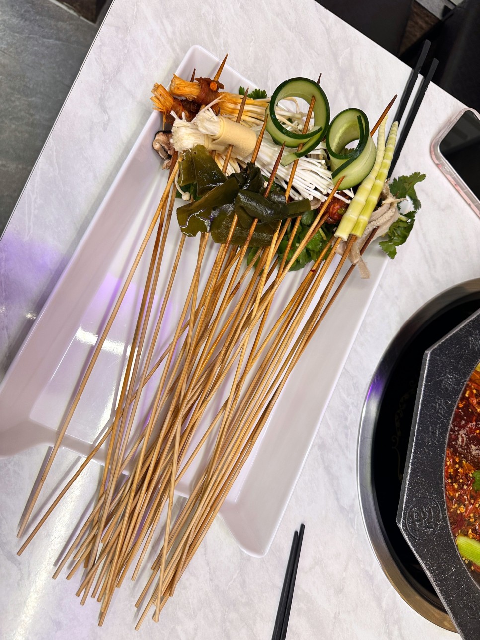 소고기꼬챙이훠궈는 신선한 소고기를 사용하여, 살짝 데쳐 먹을 때 그 육즙의 풍미가 입안 가득 퍼집니다.