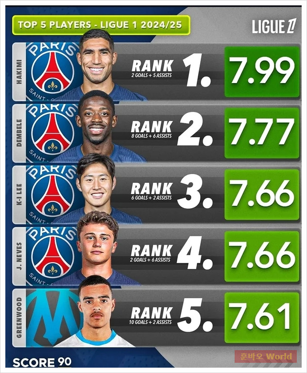이강인은 축구 통계 매체 '스코어90'이 발표한 리그1 선수 랭킹에서 당당히 3위를 차지했습니다.