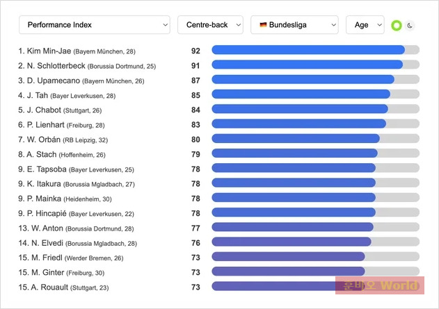 ‘데이터MB’가 발표한 센터백 랭킹에서 김민재는 92점을 기록하며 리그 최강의 자리에 올랐습니다.