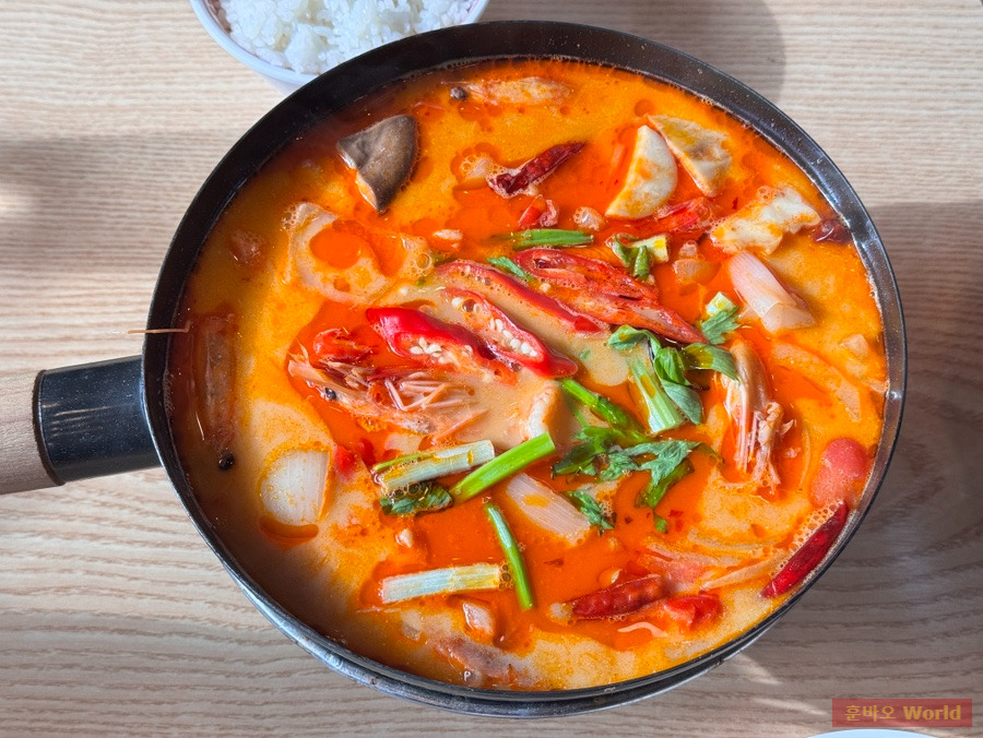 세계 3대 국물 요리로 알려진 똠얌꿍은 새콤하고 매콤한 해산물 베이스의 국물 덕분에 이국적이면서도 중독성 있는 맛이었어요.