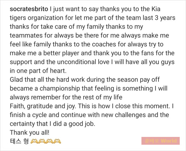 소크라테스는 자신의 SNS를 통해 팬들과 팀 동료, 코칭 스태프에게 진심 어린 감사 인사를 남겼습니다. 그는 “지난 3년간 팀에 함께할 수 있게 해주신 구단과 팬들께 감사드린다”며 KIA에서 보낸 시간에 대한 소중함을 전했습니다.