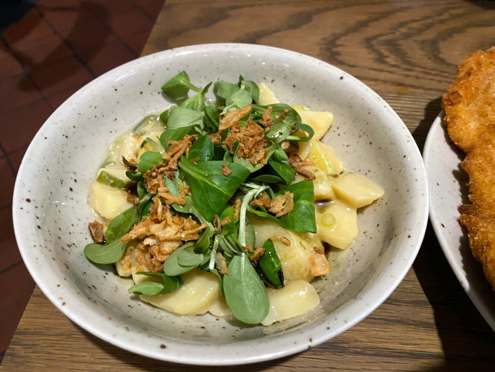 Pork schnitzel fried in pork fat, light potato salad (279,-)