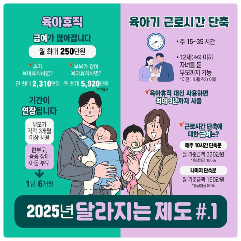 #2025육아휴직 #육아휴직제도 #고용노동부 #육아휴직급여 #육아휴직기간 #근로시간단축 #워라밸 #일가정양립 #맞벌이가정 #한부모가정 #중증장애아동 #육아혜택 #부부동시육아휴직 #정부지원 #직장맘 #워킹대디 #직장육아 #2025정책 #일하는엄마 #일하는아빠 #육아지원 #정부지원제도 #근로자복지 #직장생활 #정책브리핑 #가족친화제도 #정부정책 #육아지원금 #2025년변경사항