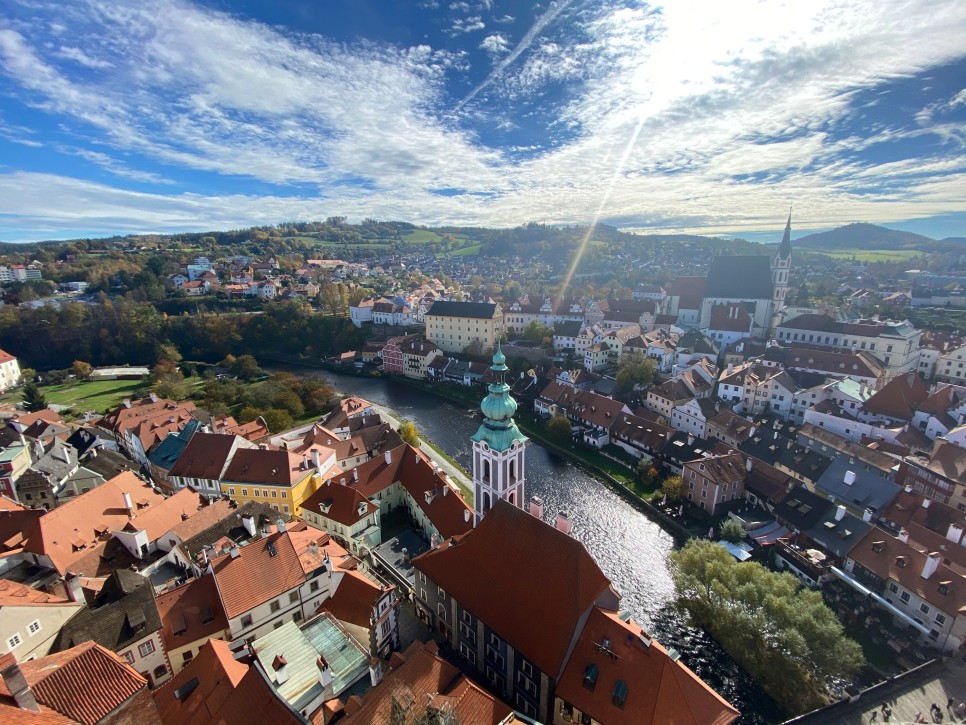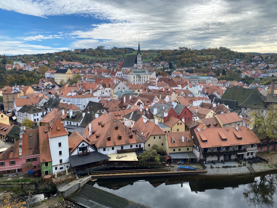 마을 전체를 S자 모양으로 휘감고 흘러가는 블타바 강과 높은 언덕 위에 자리한 성, 그리고 성 아래에 펼쳐져 있는 붉은 지붕의 집들.