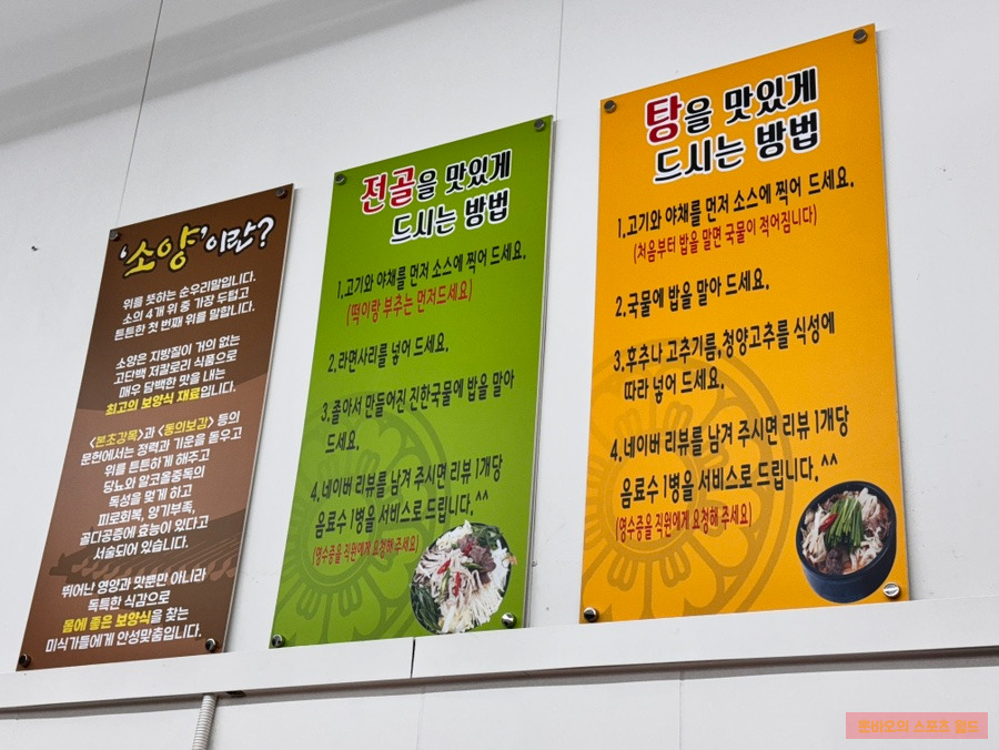 벽에는 소양탕과 전골을 맛있게 먹는 법이 친절하게 설명되어 있었어요!