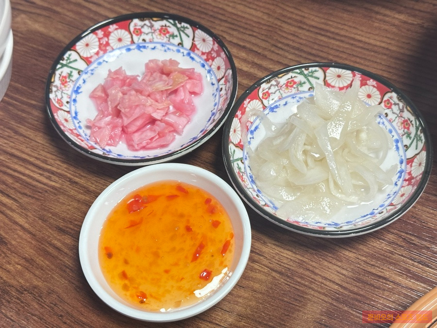 기본 반찬으로는 새콤한 피클, 양파절임, 칠리소스가 제공돼요.