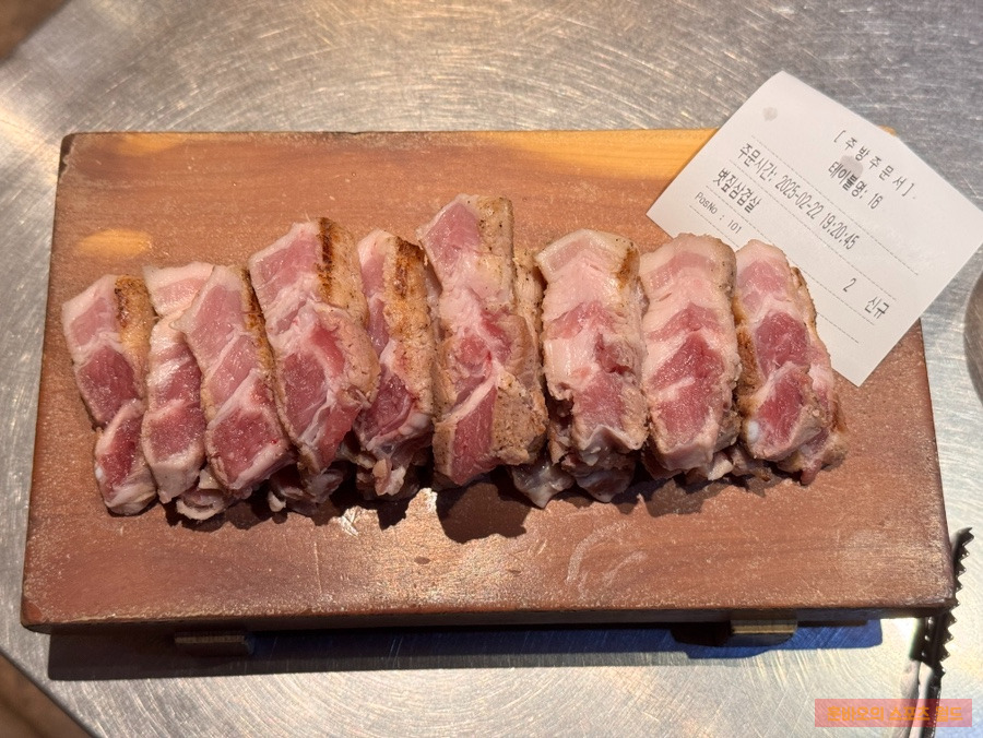 도마 위에 예쁘게 정렬된 삼겹살이 등장✨