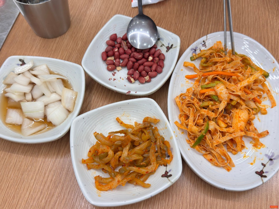 건두부무침, 생땅콩, 짭조름한 양파절임, 고추무침!