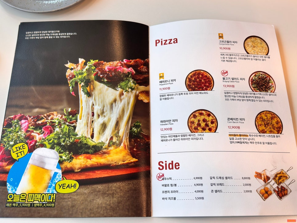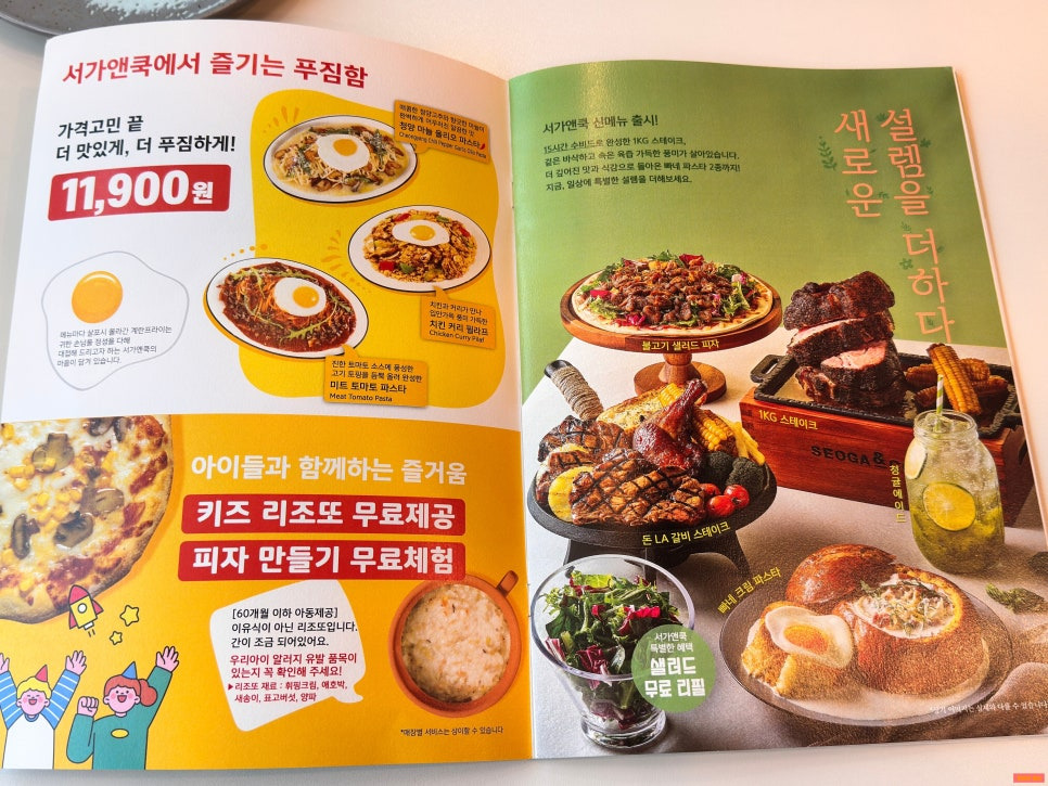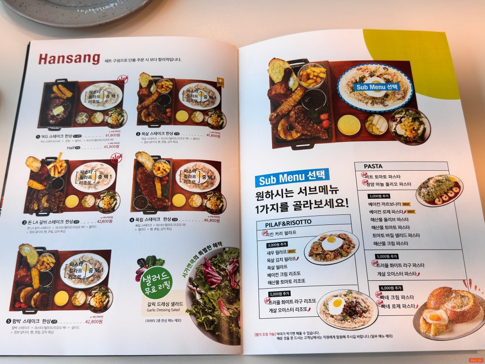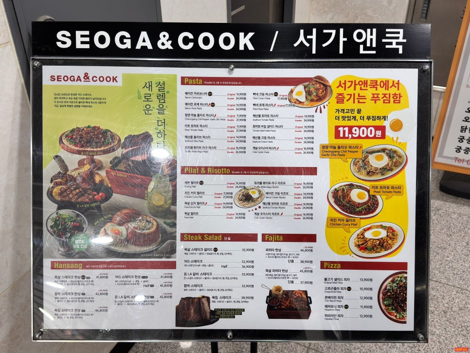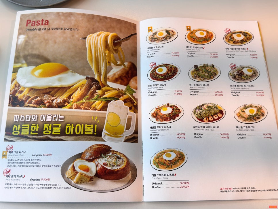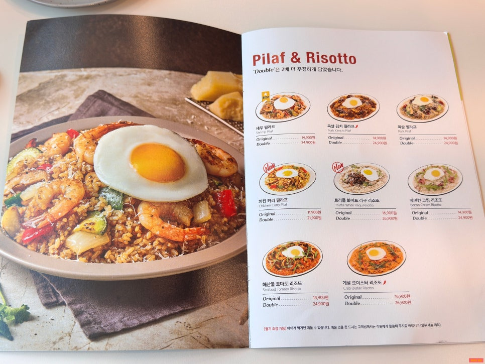 입구에 있는 메뉴판을 찬찬히 봤는데, 메뉴 구성이 엄청 다양했어요. 파스타, 필라프, 스테이크, 피자까지 골고루 있어서 선택장애 올 뻔😆 결국 저는 빠네크림파스타, 새우필라프, 갈릭브레드, 그리고 시원한 콜라로 주문 완료!