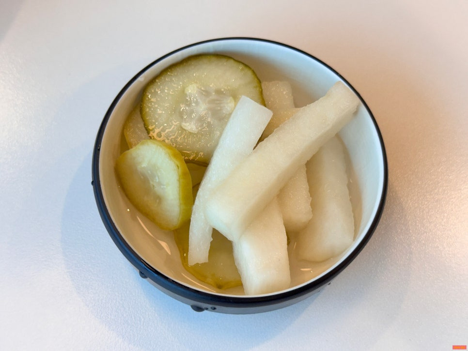 피클도 함께 나왔는데, 오이와 무가 아삭아삭! 느끼할 수 있는 메뉴와 궁합이 찰떡이라 곁들임으로 딱이에요.