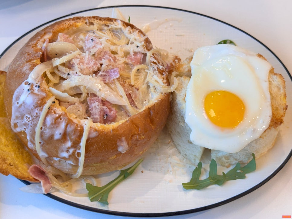 마지막으로 메인 같은 빠네크림파스타💛 커다란 빵 속에 진한 크림소스와 스파게티가 가득! 베이컨, 양파가 듬뿍 들어있어서 한 입 먹을 때마다 쫀득한 면과 고소한 소스가 입안을 감싸요. 옆에 올려진 계란후라이까지 곁들이면 부드러움이 배가된답니다. 빵도 속살까지 촉촉해서 크림소스 찍어 먹는 재미가 쏠쏠했어요.