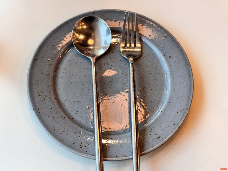 자리에 앉자마자 깔끔한 회색 접시와 포크, 수저가 셋팅됐어요. 작은 디테일이지만 이런 깔끔함이 식사 전부터 기분 좋게 해주죠😊