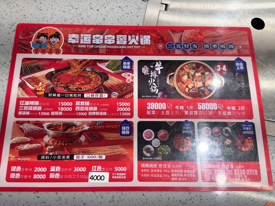 메뉴판을 보니 훠궈 육수 종류부터 꼬치 튀김 종류까지