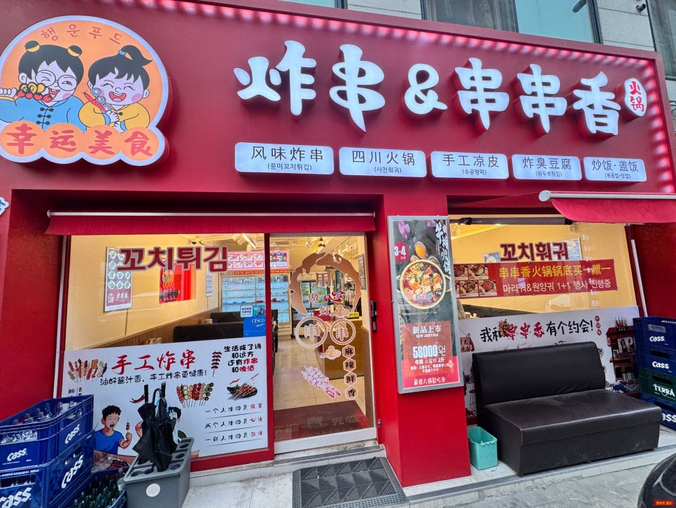 빨간 간판이 눈에 확 들어오는 행운꼬치튀김&꼬치훠궈 입구예요.