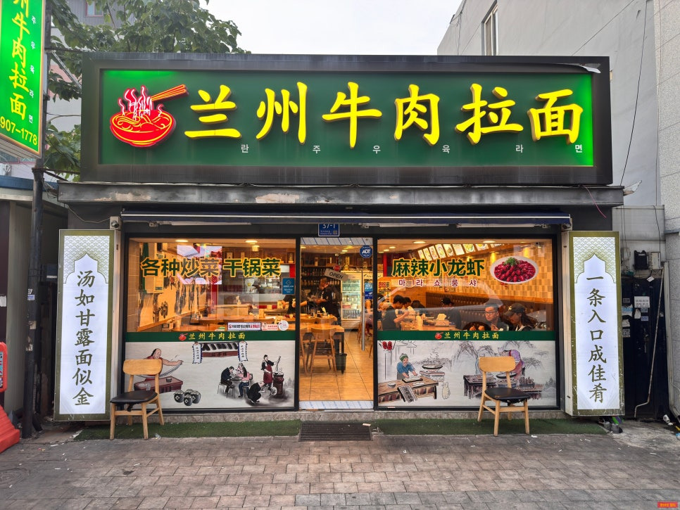 초록색 배경에 란주우육라면 노란 글씨가 큼직하게 쓰여 있어서 멀리서도 잘 보여요.