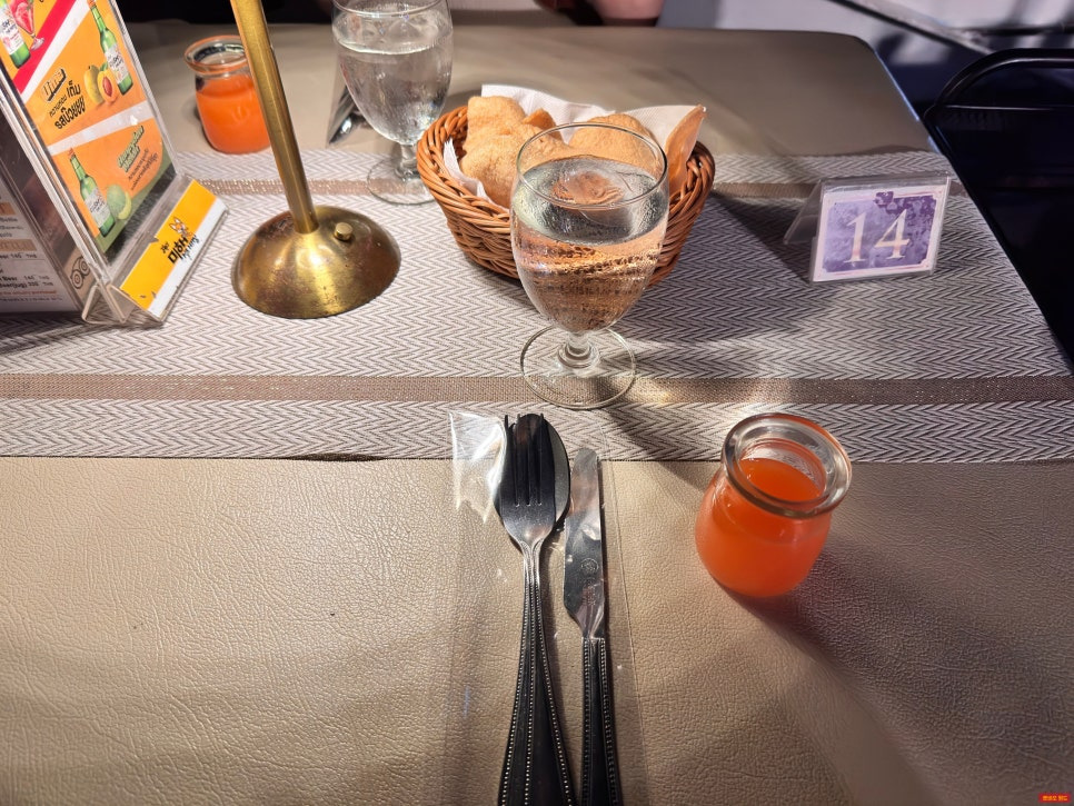 자리에 앉으니 테이블 세팅이 이미 되어 있었어요. 웰컴 드링크와 과자, 생수도 준비되어 있었답니다.