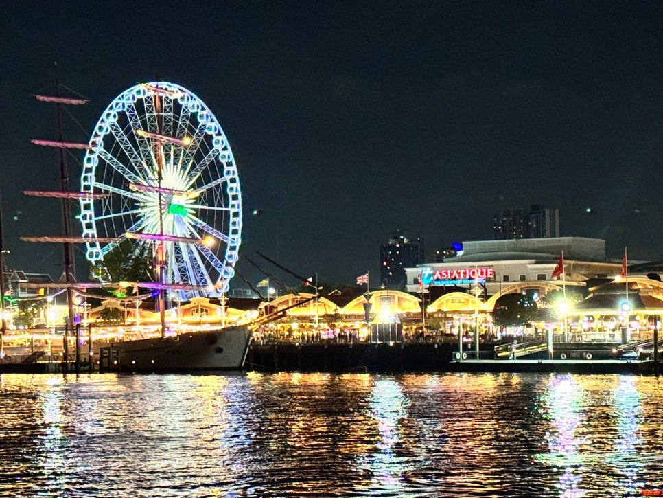 커다랗게 빛나는 'ASIATIQUE' 간판이 보이는데, 너무 예쁘고 분위기 있었어요. 포토존으로 최고였어요.