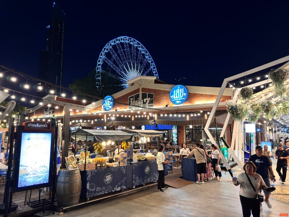날이 어두워지면서 ASIATIQUE 간판이 조명을 받아 더 예쁘게 보이더라구요. 밤에 진짜 매력 터지는 장소예요.