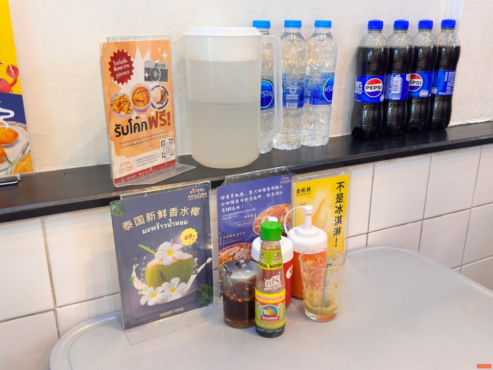 테이블에는 태국식 간장, 고추, 매운 소스 등등 다양하게 비치되어 있었어요!