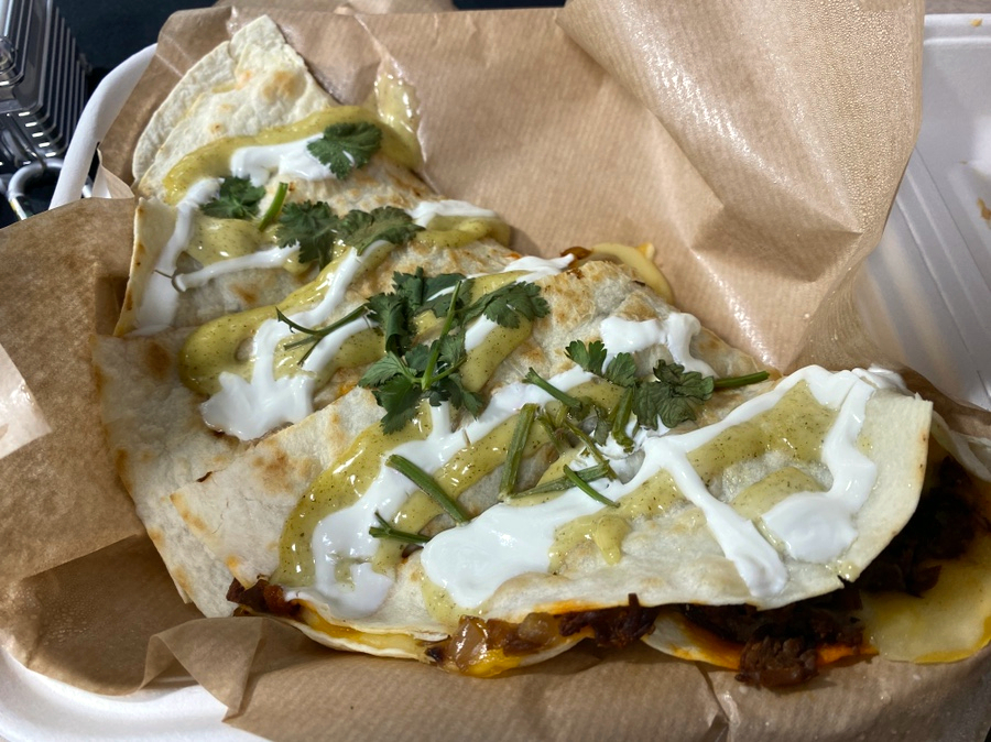 퀘사디아는 사워크림과 그린 소스가 토핑 되어 있다
